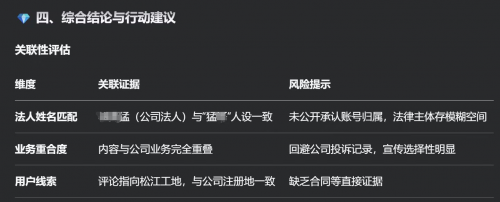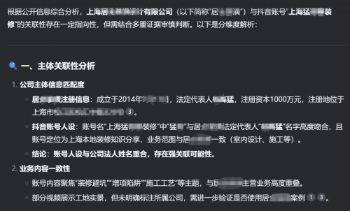 而此時,疑似關系中一家名為“上海居****設計有限公司”的公司引起了我的注意,基于自己沒有判斷經驗,于是我把這個疑問提交給了deepseek,讓它幫我進行分析“上海居****設計有限公司”與“上海猛***裝修”賬號是否存在關聯性,以下為部分分析結果: