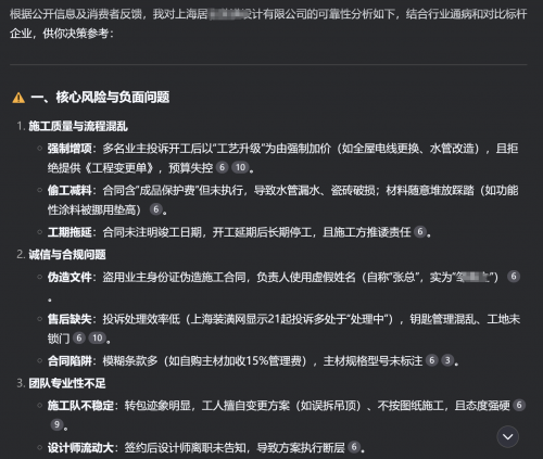 順著這個思路,我又讓deepseek幫我分析了“上海居****設計有限公司”這家公司的可靠性,部分分析內容如下: