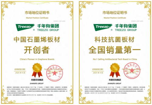 智創黑金科技,更獲得了市場地位認證加持。2025年4月,千年舟獲得“中國石墨烯板材開創者”、“抗菌科技板材全國銷量第一”等四大市場地位認證(數據來源尚普咨詢集團)。黑金科技行業領先,是科技與健康的標桿之作。