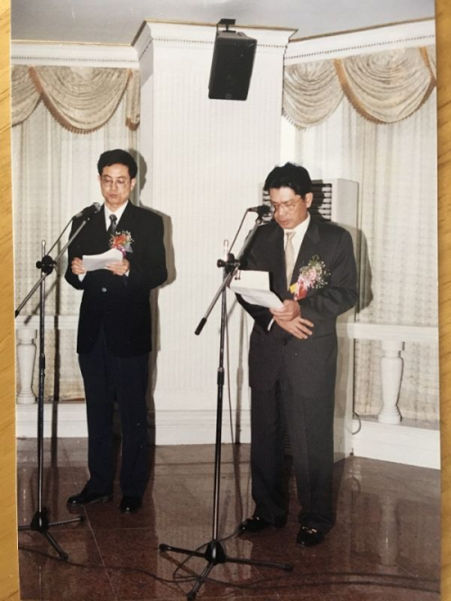 (1999年,美的東芝技術合作簽字儀式中,菜農擔任翻譯。何享健(右),菜農(左))
