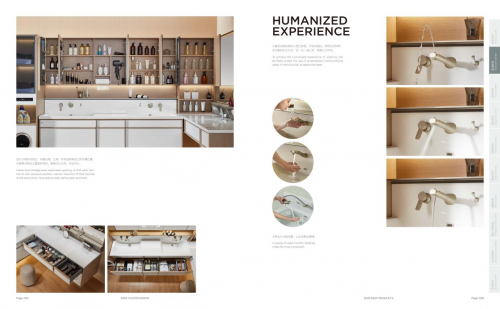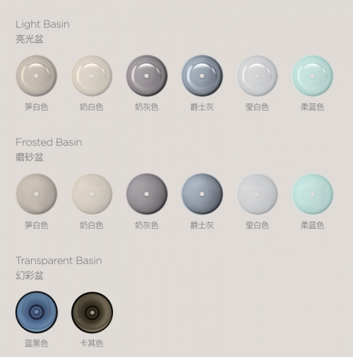 表現在2025B系列浴室柜上,光是拉手包覆,就可以提供5種顏色進行選擇,包括木紋色2種(柚木色、原木紋)、金屬色2種(鎳拉絲、紳士灰)、純色1種(筍白色);臺盆也有瑩白亮光盆、彩色亮光盆、彩色磨砂盆等多種既具時尚氣質,又帶有高級感的色彩。