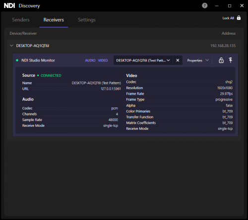 ● (四)啟動(dòng)NDI Discovery工具,此時(shí)您將看到您的Studio Monitor正在接收什么NDI源、它的視頻格式/音頻格式是什么、碼率是什么;您還可以用Discovery工具“遙控”你的Studio Monitor,為它選擇切換不同的NDI源。