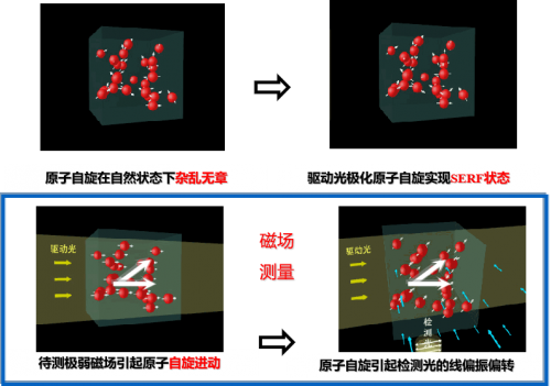 基于原子自旋原理的SERF原子磁強計,被視為人類最靈敏的量子磁場測量技術。該技術利用堿金屬原子(如鉀、銣、銫)的自旋特性,通過泵浦激光使堿金屬原子產生自旋極化。當存在外界弱磁場時,這些原子會發生拉莫爾進動,改變對檢測激光的吸收特性,從而實現fT量級的超高靈敏度磁場測量。