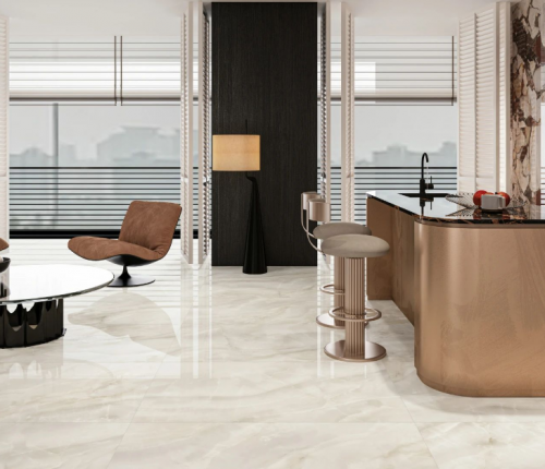 簡(jiǎn)一瓷磚專注于高端大理石瓷磚領(lǐng)域,其產(chǎn)品以還原天然石材的紋理與光澤見長(zhǎng)。整體鋪貼效果連貫流暢,猶如整塊石材鋪就,極大提升了空間的奢華感與整體性。