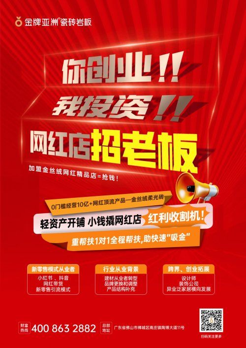 在建材家居行業(yè)新零售浪潮下,金牌亞洲憑借“網(wǎng)紅精品店盈利模式” 與“金絲絨爆品戰(zhàn)略”雙引擎,以強(qiáng)勢(shì)品牌勢(shì)能霸屏廣州南站觸達(dá)億萬高凈值人群;與此同時(shí),品牌全國(guó)首推的金絲絨網(wǎng)紅精品店招商也熱力開啟,以 “你創(chuàng)業(yè),我投資” 的誠(chéng)意,為建材行業(yè)創(chuàng)業(yè)者鋪就低門檻、高回報(bào)的路徑。陶博會(huì)期間,金牌亞洲“選金牌?贏未來”財(cái)富招商會(huì)即將啟動(dòng),在新零售浪潮中為創(chuàng)業(yè)者打開家居行業(yè)的財(cái)富新大門。