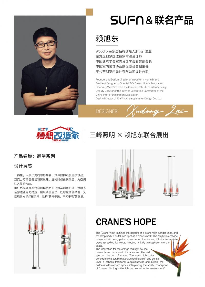 三峰照明始終將設(shè)計(jì)師聯(lián)名產(chǎn)品作為品牌發(fā)展的重要戰(zhàn)略方向之一,從早期與張建武老師跨界聯(lián)名的溯系列,到與張欣老師攜手呈獻(xiàn)的春曉系列,再到如今與賴旭東老師合作的鶴望系列,三峰照明持續(xù)與業(yè)界頂尖設(shè)計(jì)師深度合作,將設(shè)計(jì)師超前的審美理念與品牌卓越的設(shè)計(jì)落地能力相結(jié)合,為用戶帶來審美度極高的家居藝術(shù)體驗(yàn)。