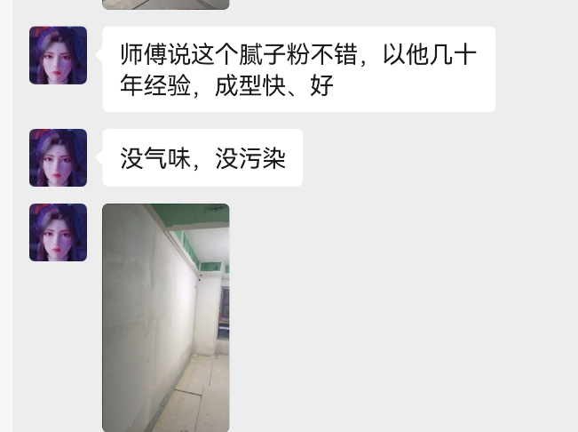 通過我購買卓瑪膩子粉的業主,我做過一些調研,反饋都非常好,起初我還擔心南方配方到北方是否適應,但發現遼寧、河北、江蘇、湖南地區的業主,對產品評價非常高,膩子精白細膩,沒有味道,很結實,硬度好,師傅也反饋批刮爽滑,打磨不脫殼不掉皮,師傅也很喜歡用,施工效率提升,沒有客訴風險,光著膀子施工都沒有問題,粉掉在身上沒有刺激性,在施工現場吃飯、午睡都沒問題,但一般的粉就不能這么干了。