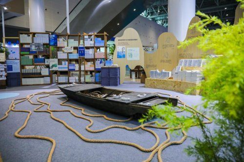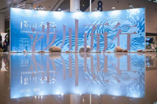 會(huì)場一隅,伊頓紀(jì)德品牌藝術(shù)展“涉川而行·全世界的河流都會(huì)重逢,一如我和你”以河流、島鏈、漣漪為核心意象,串聯(lián)起“一滴水的澄澈與明亮”“一方池塘的共生共茂”“所謂伊人,在水一方”“打開明亮的日常”四段旅程,以“文以載道”與“衣以載道”為線索,以行動(dòng)致敬美好教育。