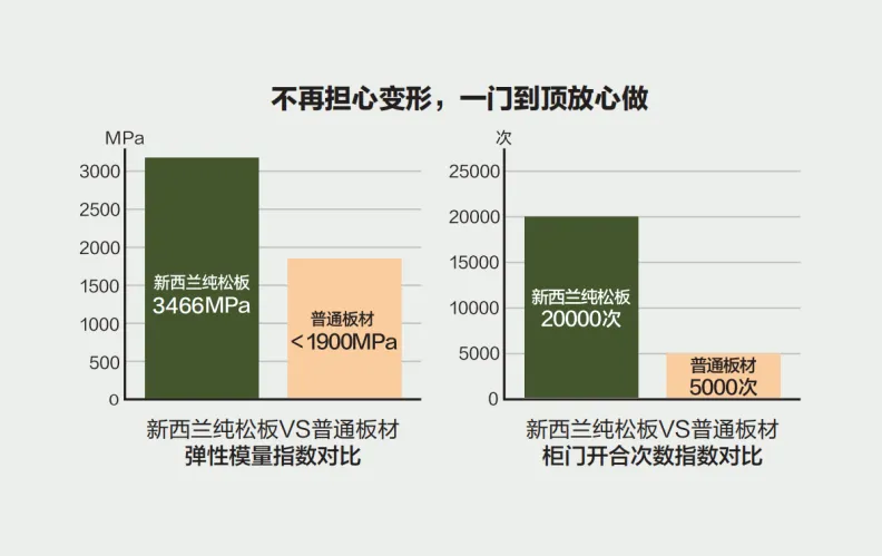 很多人放棄一門到頂的設計,只因怕板材承重變形。新西蘭純松板的彈性模量高達3466MPa,是普通板材的近兩倍,強大的抗彎性能讓柜門穩穩挺住重力考驗。經過測試,它的柜門開合次數可達20000次,而普通板材5000次的壽命往往不到一年就會出現松動。從此,無論是客廳的通頂書柜,還是臥室的整體衣柜,都能保持平整美觀,告別翹邊變形的煩惱。