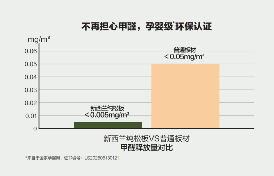 家居環保的核心在甲醛,尤其是有老人和孩子的家庭,容不得半點馬虎。新西蘭純松板通過孕嬰級環保認證,甲醛釋放量低于0.005mg/m3;,僅為普通板材的十分之一。用它打造的兒童房衣柜,無需長時間通風散味,剛安裝好就能放心使用,讓家人每一次觸摸都安心,每一次呼吸都純凈。