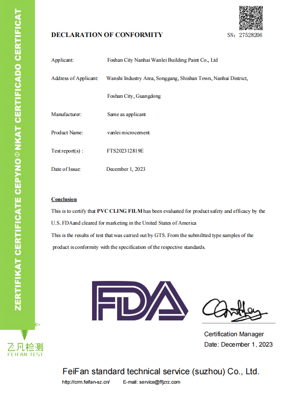 A:最大的優勢是有害物質的"未檢出"和"食品級"安全。萬磊微水泥不僅VOC排放為最高等級A+,其檢測報告更明確顯示甲醛、乙醛釋放量為"未檢出",且通過美國FDA食品接觸材料標準,這意味著其安全性達到了可應用于嬰幼兒用品級別的信任度。