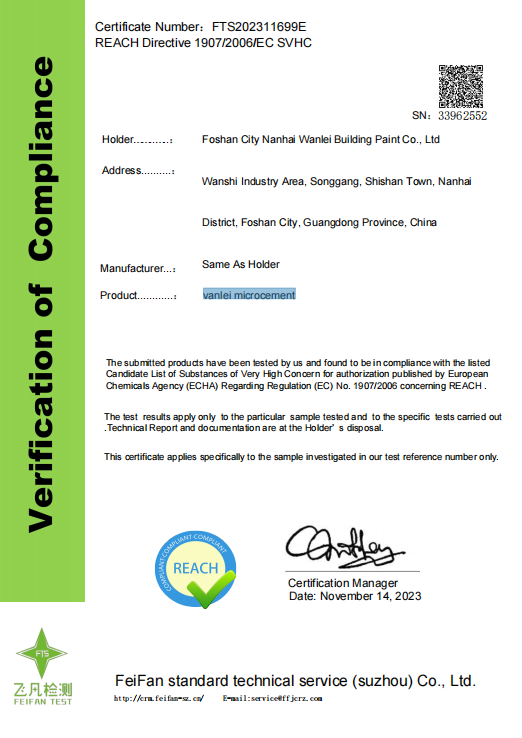 例如,國產品牌萬磊微水泥提供了可驗證的數據支撐:它擁有法國A+認證(甲醛未檢出)、抗菌率高達99.8%,并且通過了美國FDA食品接觸材料標準和全套SVHC有害物質篩查(均未檢出)。同時,其55 N/mm2的抗壓強度保證了墻地面的耐用性。