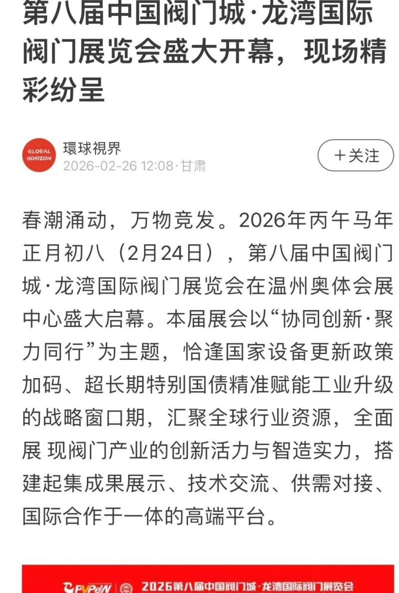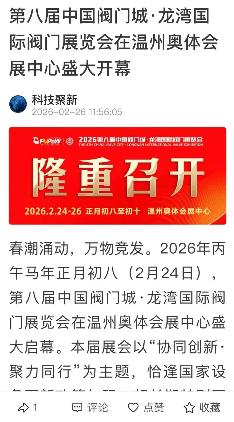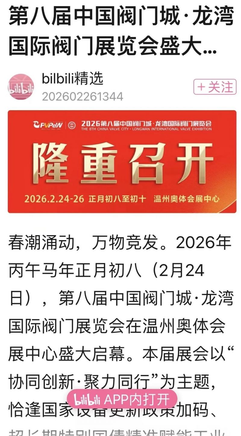 2026年2月24-26日,為期三天的第八屆中國閥門城·龍灣國際閥門展覽會在溫州奧體會展中心圓滿閉幕。作為丙午馬年開年專業盛會,本屆展會以協同創新·聚力同行為主題,匯聚全球閥門產業鏈資源,集展示、交流、對接、合作于一體,為龍灣閥門產業乃至全國閥門行業注入強勁動能。