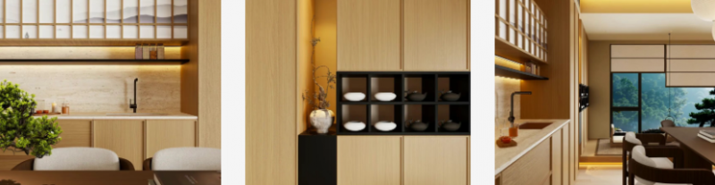 木柜的簡素輪廓呼應宋式留白,暖光漫過兩種材質的交界,暈出柔潤的層次。窗外松風,雅器輕倚,是輕語胡桃的溫潤與純松板的原生共生,把宋時的清寧意趣,織進起居的每一寸觸感,讓雅致成了日常里觸手可及的溫度。