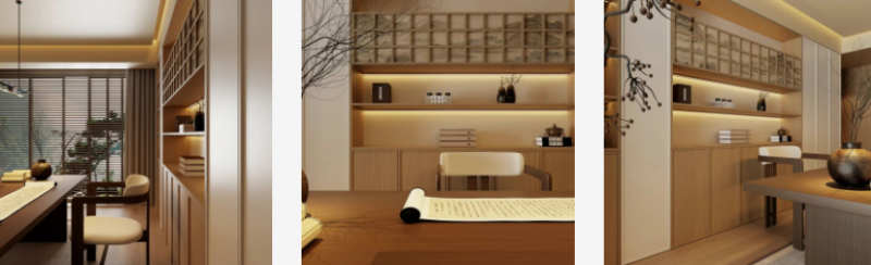 書房空間:輕語胡桃(石墨烯)花色與新西蘭純松板打造的書柜,桌面平整簡潔,書架開放式設計搭配錯落擺放的古籍與陶瓷器,復刻宋代文人書房的雅致意境;石墨烯的抗菌特性守護書籍潔凈,純松板的自然質感緩解閱讀疲勞,讓思緒在古今文脈中流轉。