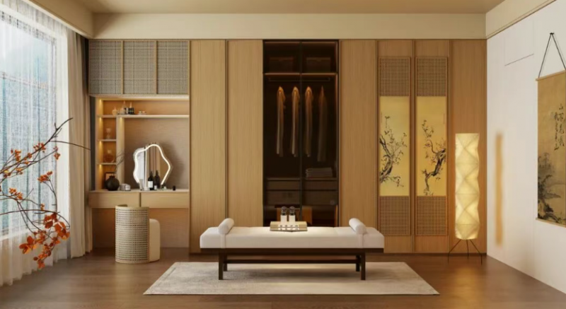 格柵門板裁出宋式留白,梅枝掛畫暈開宣紙上的疏朗,暖燈如宋瓷薄釉淌下柔光。松板承托收納的靜穆,胡桃色裹著雅意,妝臺淺光、衣區隱透,都襯著宋風的淡遠。