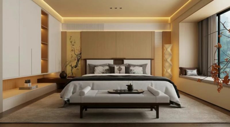 床頭木作裁出留白素凈,墻間梅枝探入宋人疏朗,燈影是宣紙上暈開的暖黃。松板輕軟承一夜清夢,胡桃雅色裹歲時靜穆。這方室里,宋式的簡淡與材料的柔潤相和,織就滿室淡遠溫良,每一寸都是東方雅意的輕語。