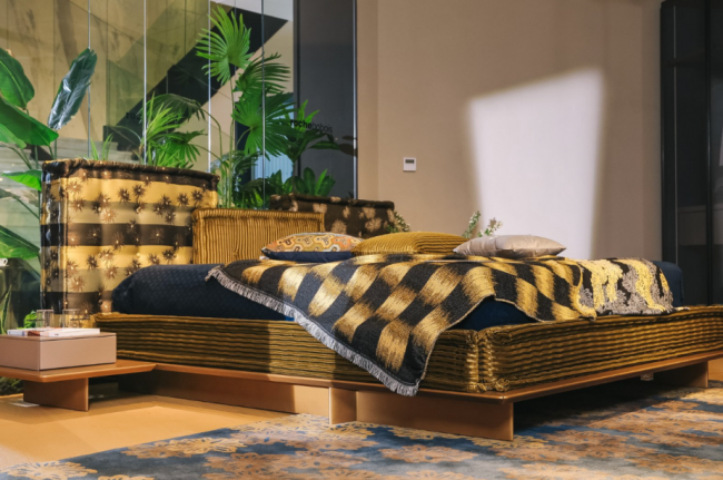 行至三樓,進(jìn)入阿莫多瓦的金色帷幕。這一由導(dǎo)演親自選定的色彩將空間塑造成沉浸式電影院。新品Lounge Pedro Almodóvar 沙發(fā)錯(cuò)落散置于其間,如隨性的觀影坐席,讓觀者自然融入阿莫多瓦的電影宇宙——色彩濃烈、情緒爆滿、敘事張力十足。在此,家居已化身為承載敘事的藝術(shù)媒介。