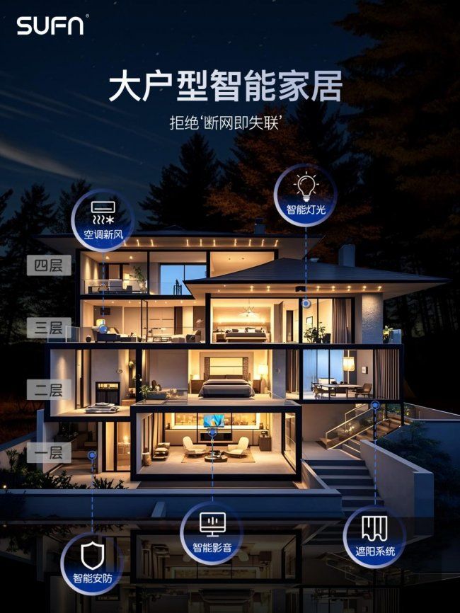 三峰全屋智能家居系統的核心優勢體現在極致的穩定性。不同于行業常見的集成第三方系統的模式,三峰完全自主掌控底層代碼邏輯,行業首發去網關跨樓層方案,告別“斷網即失聯”的尷尬,極端情況下單設備故障不影響全局運行。針對別墅大宅大空間、多設備的使用場景,SUFN OS系統可穩定支持上百臺智能設備的同時聯動響應,攻克大戶型控制難題。