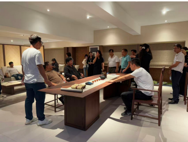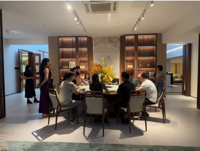 考察團一行先后走進卡琳家具展廳,沉浸式體驗以宋式美學與中古混搭風為核心的家具空間場景。從線條簡約雅致的宋式家具,到沉穩大氣、質感溫潤的中古混搭系列產品,每一處設計、工藝細節與空間布局,都充分展現出傳統美學與現代生活的完美融合。考察團邊走邊看,細致了解產品研發、材質工藝、空間搭配及品牌理念,對展廳雅致靜謐的氛圍、精益求精的品質贊不絕口。