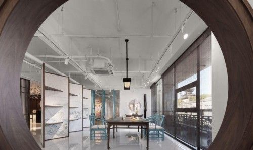 茶書房屏風隔斷選取了王希孟的《千里江山圖》,煙波浩渺的江河、層巒起伏的群山構成了一幅美妙的江南山水圖,動靜結合恰到好處。