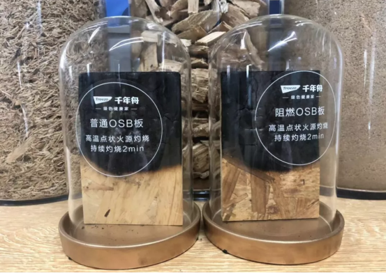 千年舟集團不僅有千年舟實木切片OSB生態(tài)板,還推出了具有阻燃功效的OSB板。目前,市面上現(xiàn)有的阻燃板材大多采用單板浸泡的方式達到板材阻燃的效果,這種方式處理的單板如后期烘干不到位會影響板材的質(zhì)量,如開膠、變形、龜裂等質(zhì)量問題。