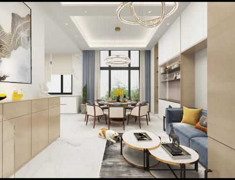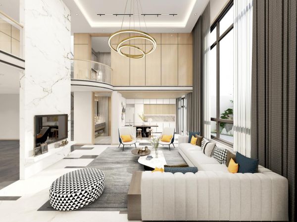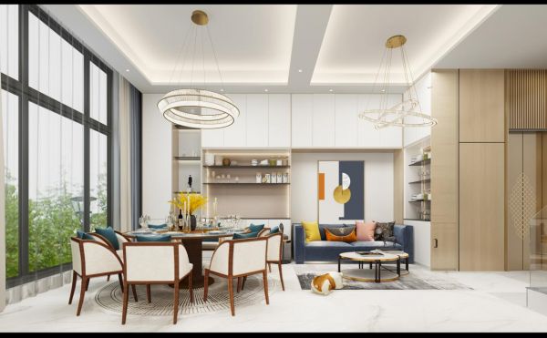 一層采用開放性布局,空間與空間之間協調融合,又不失各自的個性。大面積的采光設計,增加整體空間的明亮度,豐富空間層次。