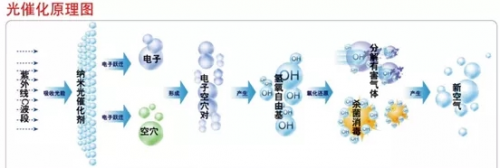 通過特定的波長光線照射,激活納米光催化劑,生成電子-空穴對,使光催化劑與周圍的H?O分子、O?分子發生作用,結合生成氫氧自由基OH,通過氫氧自由基層OH層層鎖住空氣中各種有害成分,分解有害成分構造,抑制細菌生長和病毒活性能力,從而達到殺菌,空氣凈化,除臭、防霉、消除空氣污染的目的。