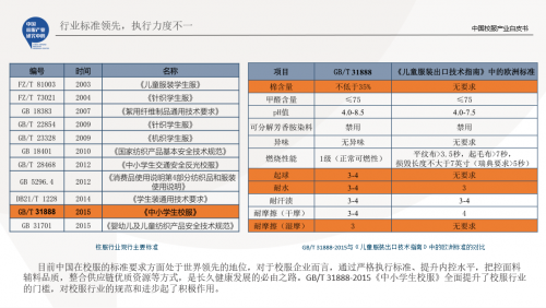 2015年,伴隨著教育部等國家四部委“校服新政”的出臺,GB/T 31888-2015《中小學生校服》國家標準也頒布實施。根據(jù)《中國校服產(chǎn)業(yè)白皮書》的統(tǒng)計,這一標準在很多項目上是高于出口歐洲的標準的。我們甚至可以說它是童裝領域在技術指標上的最嚴標準。標準的提升勢必也意味著校服企業(yè)在生產(chǎn)校服過程中的成本的增加,而這一點,也最終反應在了校服的價格上,校服價格的上漲是校服質量提升的一個必然的結果。“一分錢一分貨”的道理在校服上同樣適用。因此,對于部分家長來說,需要調高一些對于校服價格的預期,讓孩子穿著安全的優(yōu)質的校服。
