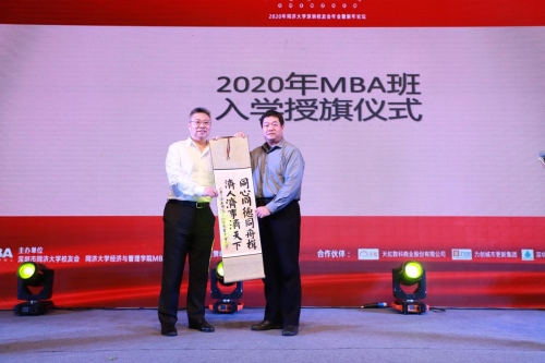 值得一提的是,在圓桌論壇結束后,活動現場還進行了2020年MBA班級入學授旗儀式,李凱會長與施騫書記共同展開了“同濟天下”卷軸。