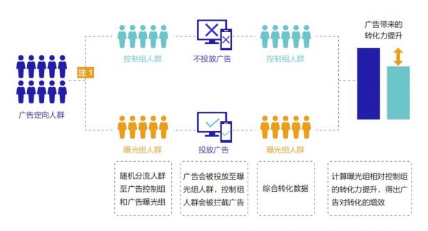 在實際運用中,增效度量通過巨量引擎科學A/B分流能力,在營銷投放時通過選定曝光組和控制組,來對比并度量“看到”廣告產生的增量價值的度量方法。通俗地講,增效度量通過將特征完全相同的人群提前劃分為“能看到廣告”和“不能看到廣告”,然后通過對比兩群人在廣告投放后一段時間內的轉化差異、行為差異或用戶認知差異等,量化廣告效果。