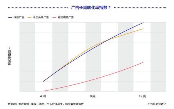 巨量引擎短視頻廣告基于更高增效轉化能力+拉新能力,優化媒介預算組合提升轉化效果。在對比不同媒體轉化率時,抖音與在線視頻廣告相比,在更高頻的觸達下,增效轉化率展現出明顯優勢。通過增效度量,巨量引擎探索更優“品效組合”,在相同頻次下進行品牌+效果廣告疊加的增效轉化,提升后鏈路轉化效率。