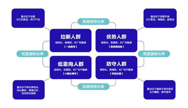 基于增效度量,巨量引擎還進行人群策略升級,通過直接轉化和增效轉化交叉出的人群矩陣,幫助品牌清晰全面地了解優勢人群、拉新人群、防守人群及低意向人群,并根據不同人群屬性,制定相應的貨品策略,從而全面提升拉新滲透效率。