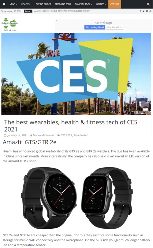 除了傳統的科技門戶媒體之外,英國頭部穿戴類垂直科技媒體 Wareable 也將 Amazfit GTS 2e & GTR 2e 列入CES 2021最佳穿戴設備行列,重點強調了新款手表的續航及高性價比。在智能穿戴專業媒體眼中,Amazfit GTS 2e & GTR 2e 的續航與高性價比讓它們在眾多智能產品中脫穎而出。