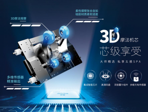 3D摩法機芯,搭載微電腦智慧芯片組,敏銳極速識別人體形體曲線、穴位和肌肉群,輸出按摩數(shù)據(jù),精準智能解析身體疲勞部位,柔性擺臂張合自如,多維傳感器精準輸出。