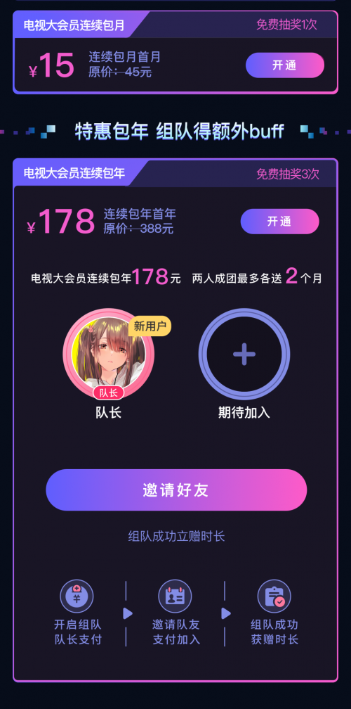 正式活動在4月30號上午10點開始,這次狂歡趴活動拒絕一切套路,簡單、直接,但是福利滿滿。首先35元的月卡會員,本次活動首月只要15元就能get,同時還能獲得1次100%中獎的機會;而388元的年卡會員,只要178元就能享受372天的尊貴會員身份,100%中獎的機會提升到3次,幸福感爆棚!更有驚喜的玩法,用戶可以組隊訂購會員年卡,若用戶成功邀請一位好友組隊成功訂購年卡,則每位成員可獲贈3次抽獎機會及額外1個月電視大會員時長,如組隊隊伍中有電視大會員新用戶,則同隊2位成員將額外再獲贈1個月電視大會員時長,也就是2人同時獲贈2個月會員時長!