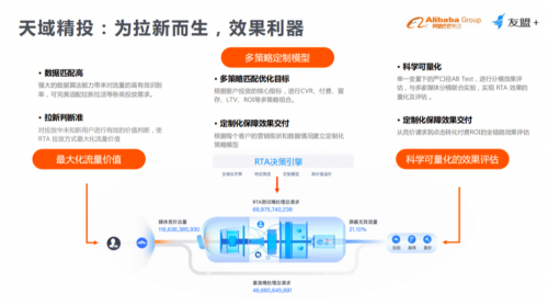此外,基于阿里巴巴的技術能力,友盟+再次打造了專為用戶增長而生的工具:天域精投。天域精投可以基于數據能力和媒體開放的RTA能力,幫助客戶進行效果投放和拉新。