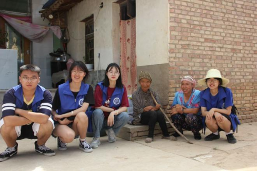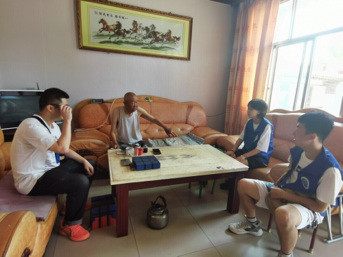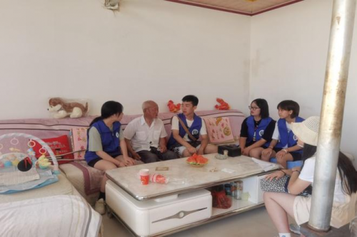 圖為青年學(xué)生志愿者進(jìn)村看望孤寡老人