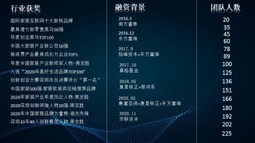 全屋優(yōu)品科技作為一家致力于打造一站式家居軟裝解決方案的企業(yè),憑借著創(chuàng)新的商業(yè)模式,持續(xù)賦能行業(yè)轉(zhuǎn)型升級(jí),始終堅(jiān)定賽道從未止步,從創(chuàng)立至今榮獲多項(xiàng)行業(yè)大獎(jiǎng),連續(xù)獲得7輪融資,團(tuán)隊(duì)也由當(dāng)初不到30人發(fā)展至如今的200多人。