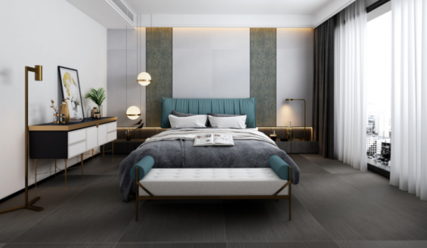 臥室背景墻采用瑪緹瓷磚的雅典白系列,看似空無一物,又似滿溢而出,營造出清新自然的臥室氛圍,搭配深灰色的地面倍顯時尚高雅,又頗有一番低調的奢華韻味。