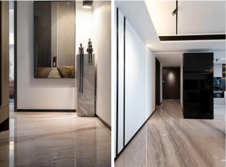 玄關(guān)處以灰白色作為主色調(diào),給人一種干凈簡潔的感覺;地面沿用簡一希臘灰大理石瓷磚進(jìn)行密縫鋪貼,以淺灰色為底色,磚面上分布著一些深淺不一的灰色紋理,自然細(xì)膩,高度還原了天然大理石的色澤和質(zhì)感。一走入玄關(guān)處,密縫鋪貼的效果就讓人眼前一亮,同時也奠定了整屋時尚大氣的基調(diào)。