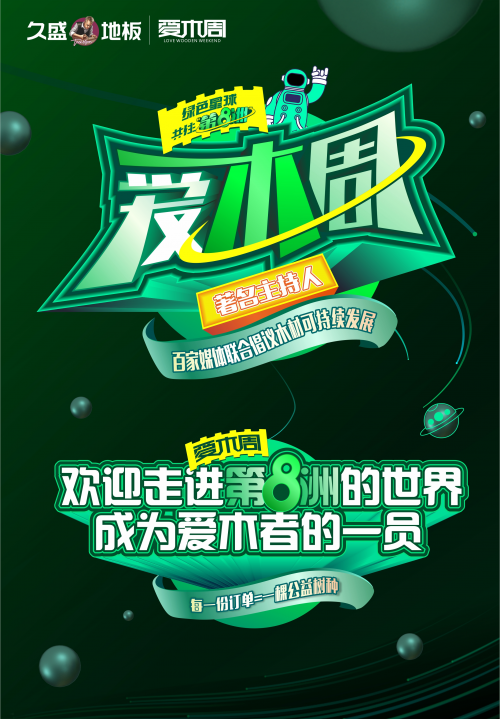 自2014年久盛推出“愛木周”品牌活動以來,每年都以不同的主題和意義呼吁更多的愛木者與久盛一起宣揚愛木、懂木、治木的理念。今年,久盛提出“綠色星球,共住第8洲”的主題,更將通過一個訂單=一份公益,號召消費者們為綠色、健康、美好空間提供更多的力量。