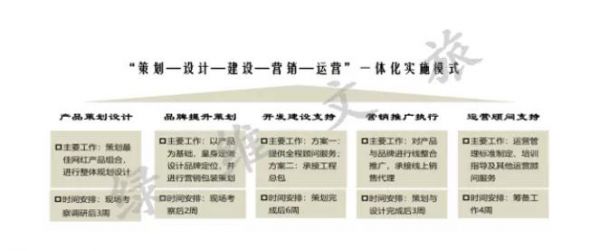 本模式是堅持“后端導入前端”,以可持續經營與效益實現為目標,將產品策劃設計、品牌提升策劃、開發建設支持、營銷推廣執行、運營顧問支持五大環節,形成一體化解決方案,力爭3-5個月完成從策劃到落地開業工作。從策劃設計層面便深化細節、思考建設與運營階段的實際需求;在執行層面深刻理解設計理念與文化內涵,相互補充、層層疊加,助力實現產品快速落地運營。