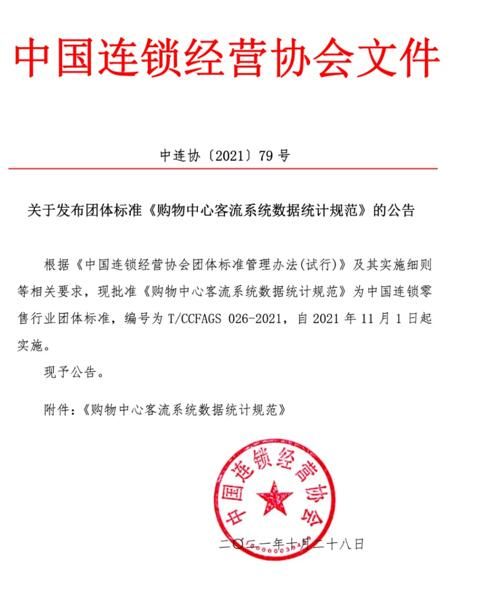 根據《中國連鎖經營協會團體標準管理辦法(試行)》及其實施細則的相關要求,經起草、廣泛征求意見、專家審查等環節,中國連鎖經營協會(CCFA)批準發布《購物中心客流系統數據統計規范》(編號T/CCFAGS 026-2021)團體標準,自2021年11月1日起實施。
