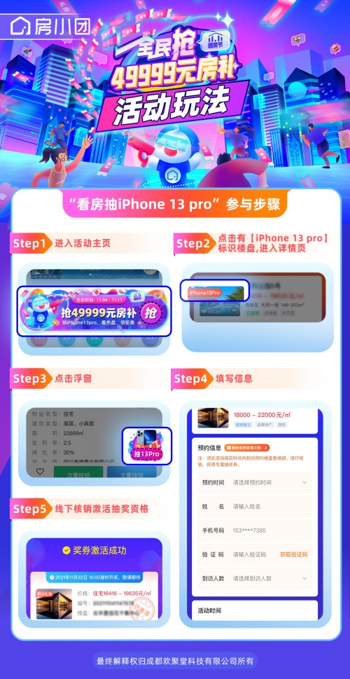 11月4日-11日,進(jìn)入房小團(tuán)小程序活動(dòng)頁(yè),點(diǎn)擊報(bào)名心儀樓盤參與“看房抽iPhone13Pro ”,杭州、南京11月21日前完成線下看房打卡流程,11月22日10:00活動(dòng)準(zhǔn)時(shí)開獎(jiǎng),成都11月30日前完成線下看房打卡流程,12月1日10:00活動(dòng)準(zhǔn)時(shí)開獎(jiǎng),房小團(tuán)將在線下為中獎(jiǎng)錦鯉送出獎(jiǎng)品。