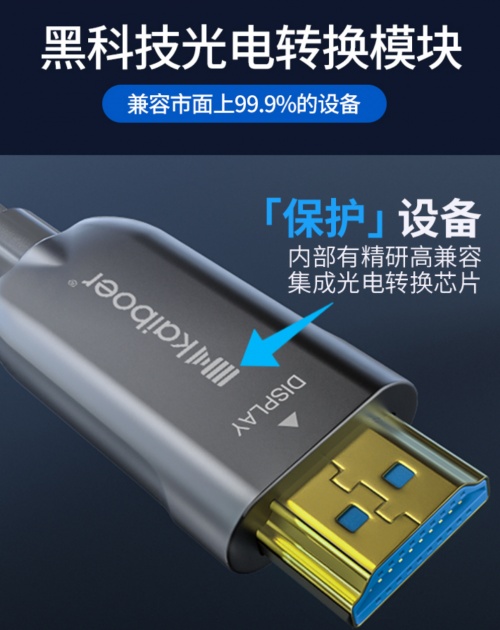 開博爾五代萬兆光纖HDMI2.1高清線插口為銅殼鍍金材質制成,具有防磨耐用等特點,鍍金接口對信號的傳輸穩定也起到一定的好處。由于產品采用的光纖技術,而光纖又具有收發順序,所以在使用過程中,比銅線要麻煩點,不過產品接頭上已經做好標注Source、Display接口,讓用戶一目了然。