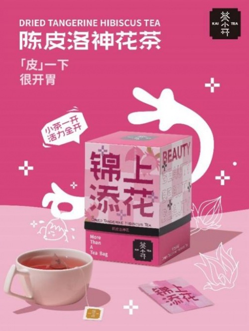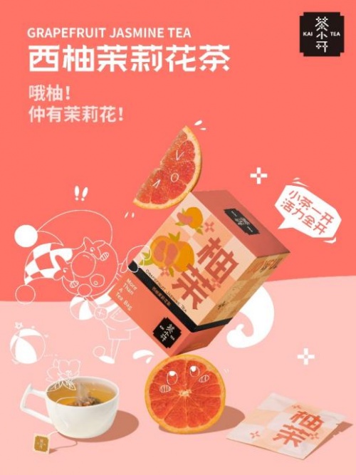 今年10月,茶小開品牌發(fā)布了水果茶、花草茶、養(yǎng)生茶三大系列,首批十款產(chǎn)品上市。其中,水果茶系列包含了西柚茉莉花茶(柚茉)、蜜桃烏龍茶(桃氣)和哈蜜瓜烏龍茶(甜蜜);花草茶系列包含陳皮洛神花茶(錦上添花)、玫瑰紅茶(大紅大紫)和梔子綠茶(梔氣東來);養(yǎng)生茶系列包含博士酸棗仁茶(棗脫單)、紅豆薏米茶(薏中人)、桂圓紅棗枸杞茶(枸富貴)、紅糖姜棗茶(不姜就)。
