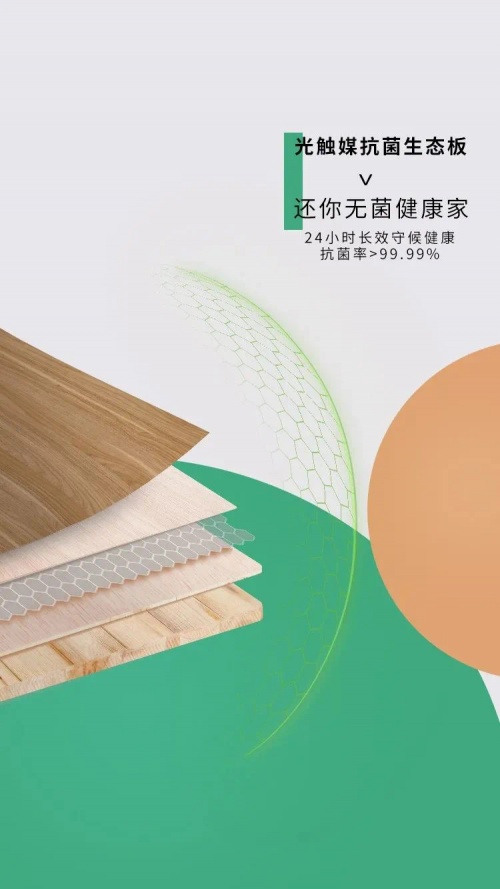 此外,天然豆香抗菌生態板的一大亮點在于,運用“黑科技”——光觸媒技術,具有優秀抗菌性能,24小時持久抑菌,有效催化細菌降解,也可抑制常見霉菌的生長。據廣州微生物研究所的檢測,此款板材可有效分解日常生活中常見的金黃色葡萄球菌、大腸桿菌等各種致病菌,抗菌率超過99.99%。