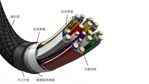 另外,祈翱在HDMI線身外部材質方面頗下功夫,采用高規格工程用五大屏蔽層方案——線芯絕緣層、鋁箔層、鍍錫銅網、PVC護套及編織層,阻斷日常可能發生的幾乎所有信號干擾,大幅提高線材使用壽命,讓玩家省心放心,舒適享用無損影畫。
