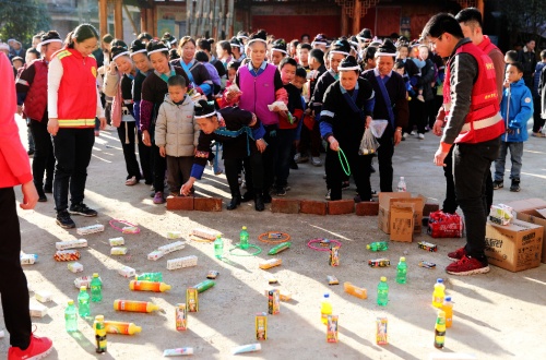 在多耶歌聲中,聯(lián)誼活動的重頭戲“迎新春游園會”也拉開了序幕。兩面針公司志愿者們精心策劃了“財源滾滾”“幸運(yùn)套圈”“歡樂響鑼”“毽子翻飛”等趣味項目,并為村民們準(zhǔn)備了兩面針日化產(chǎn)品及日用百貨、飲料零食,大家踴躍參與到活動中,踢球射門、飛圈套禮、蒙眼敲鑼、踢毽競賽,無論是孩童,還是大人,都樂在其中,獲得獎品更是喜笑顏開,心情美美噠!